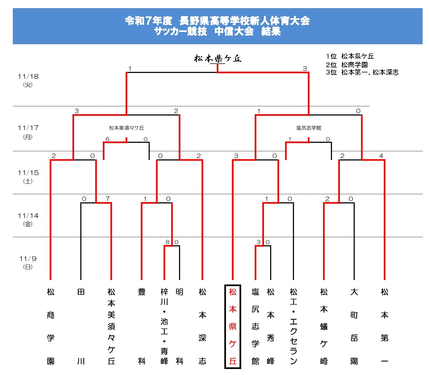 R7年度 新人戦中信大会 決勝の結果 2025.11.19 松本国際は北信越PL、都市大塩尻は北信越PL昇格を掛けたPOのため県大会から。中信地区からは6校が県大会の切符をかけて戦います。2校がいないとはいえ、中信新人久しぶりの優勝。実質、中信地区3位で県大会に臨みます。 H27年度(2015年度)をプレイバック!【縣陵サッカーHISTORY】R7年度 新人戦県大会 結果